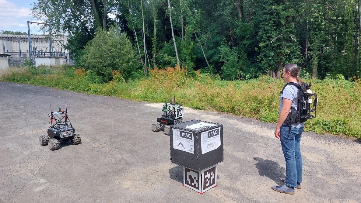 Using two autonomous ground robots embedded with a computer, the system works by allowing interaction between an geolocalised operator and the swarm, using a Battle Management System and a fleet navigation algorithm.